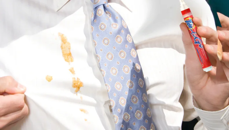 The sooner you address splotches and spills, the more successful you’ll be getting them out. Keep Tide To Go Instant Stain Remover with your laundry supplies to dab dirt, grease, and other spills away before they set. Just make sure stains are gone (rewashing may be necessary) before putting clothing in the dryer, as the heat will set the stain and make it harder to remove.